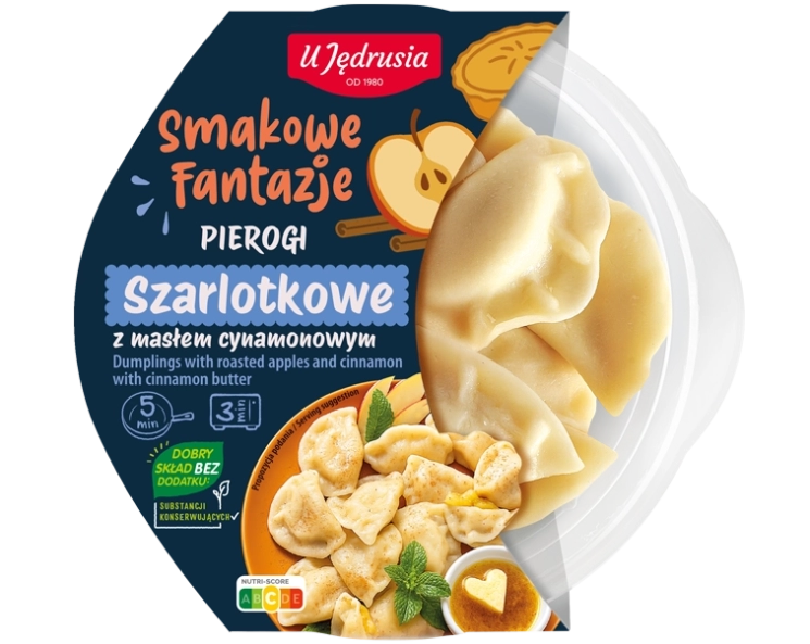 Dumplings with roasted apples and cinnamon 95,6% (roasted apples with cinnamon 43,5% (apples 82% (in roasted apple), sugar, corn starch, concentrated apple juice 3%, acidity regulator: buffered vinegar; cinnamon 0,1% (in roasted apple), wheat flour, water, rapeseed oil, salt), cinnamon butter 4,4% (butter (from milk) 91,5%, sugar, cinnamon 3%, natural flavourings).