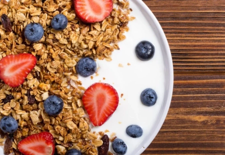 Szukasz pomysłu na lekkie śniadanie albo przekąskę do pracy? Bez wysiłku przygotujesz jogurt naturalny z pysznymi dodatkami. Klasyczny, typu greckiego albo popularny obecnie skyr, smacznie komponuje się z owocami (świeżymi i suszonymi), orzechami i musli. Ulubioną kompozycję można uzupełnić o granolę, gorzką czekoladę albo miód. Pomysłów na pyszne połączenia jest mnóstwo, a wszystkie łączy krótki czas przygotowania. Poza tym, mieszankę dodatków można zalać jogurtem bezpośrednio przed spożyciem. Dzięki temu będzie obłędnie pyszna i bardzo chrupiąca!