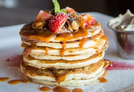Pancakes to pyszne naleśniki w stylu amerykańskim. Zachwycają charakterystycznym, pulchnym ciastem i niepowtarzalnym smakiem. Uwielbiane za niewielki rozmiar (do złudzenia przypominają tradycyjne placuszki), są genialną bazą dla ulubionych dodatków: owoców, bitej śmietany, musów i syropu klonowego. Przygotowanie ich nie jest czasochłonne, jednak idealne pancakes wciąż udają się nielicznym. Szkoda, bo są świetnym pomysłem na drugie śniadanie albo słodki deser do pracy. Z pancakes nie trzeba jednak rezygnować - gotowe są idealnym wyborem do lunchboxów. Doskonale komponują się zwłaszcza ze świeżymi owocami i syropem klonowym. Cieszą smakiem kiedy są ciepłe, a najlepiej smakują podgrzane na patelni lub w piekarniku.