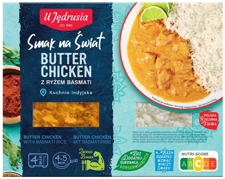 mięso z kurczaka w sosie pomidorowo-śmietankowym z masłem 55 % (mięso kurczaka 41 %, pomidory w soku pomidorowym 30 % (pomidory 65 %, sok pomidorowy), śmietanka 15 %, cebula, masło 5,2 %, pasta czosnkowa , pasta imbirowa (imbir, ocet spirytusowy ), przyprawy (w tym kolendra, papryka, kurkuma), sól, jogurt w proszku, olej rzepakowy, cukier, skrobia modyfikowana kukurydziana, koncentrat soku z limonki, regulator kwasowości: ocet buforowany), ryż basmati gotowany 45 % (woda, ryż biały basmati 46 %, olej rzepakowy, regulator kwasowości: ocet buforowany).